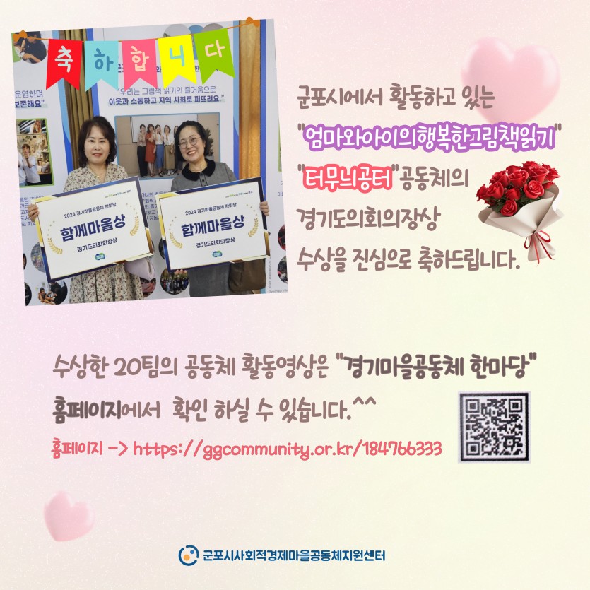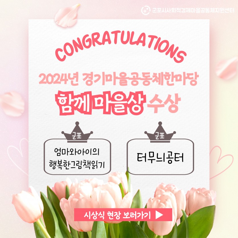 제목 경기마을공동체한마당 우수사례 수상 현장 게시판 리스트 옵션 Date 24-10-31 13:05 View 918 본문 센터소식 상세보기 이전 & 다음 항목(표)입니다. 이 표는 이전, 다음으로 구성되어 있습니다. 이전글 2024 마을공동체 2차 회계점검 모니터링 24.11.04 다음글 군포시 마을공동체 네트워크 기획단 추진위원 3차 간담회(10/18) 후기 24.10.29 목록