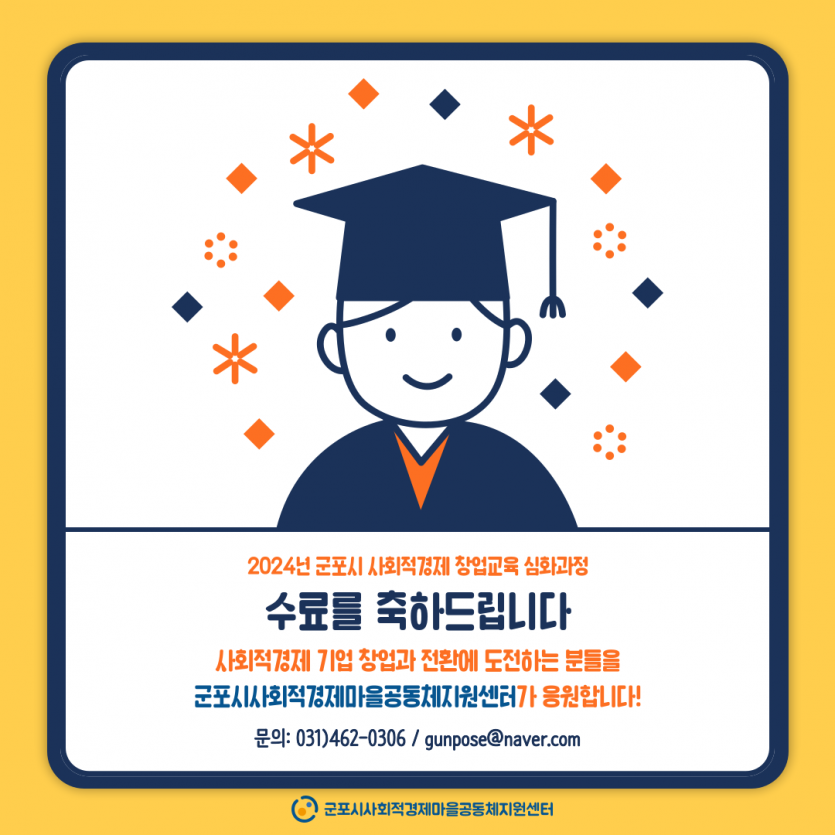 제목 2024년 사회적경제 창업교육 심화과정 게시판 리스트 옵션 Date 24-05-16 14:07 View 1968 본문 2024년 사회적경제 창업교육 심화과정이 5회의 과정을 모두 마치고 23분의 수료자를 배출했습니다참여해주신 모든 분들께 감사드리며, 심화과정의 수료를 진심으로 축하드립니다!!군포시의 사회문제 해결과 사회적 가치를 위해 창업에 도전하는 분들의 모습이 아름답습니다그 열정적이었던 2024년 군포시 사회적경제 창업교육 심화과정의 현장을 여러분께 공유합니다 센터소식 상세보기 이전 & 다음 항목(표)입니다. 이 표는 이전, 다음으로 구성되어 있습니다. 이전글 청소년 사회적경제교육(학교밖청소년) 24.05.17 다음글 군포시 마을공동체 네트워크 기획단 추진위원 간담회(5/10) 후기 24.05.13 목록